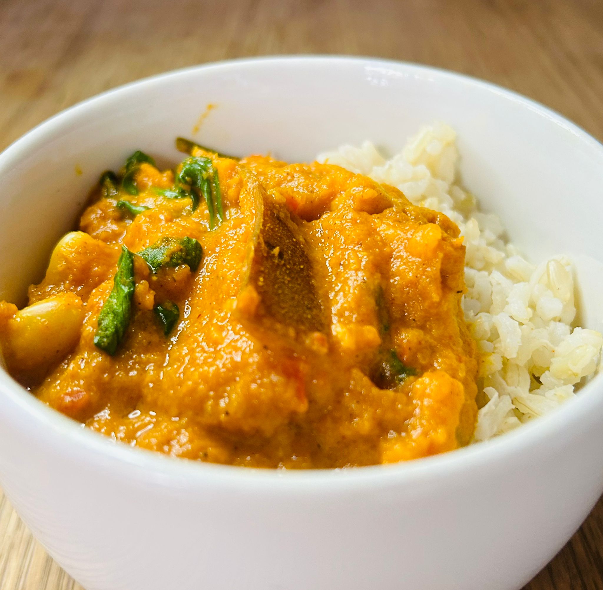 A fragrant, mild coconut curry with chickpeas, spinach and sweet potato served with wholegrain rice. Served with brown rice.