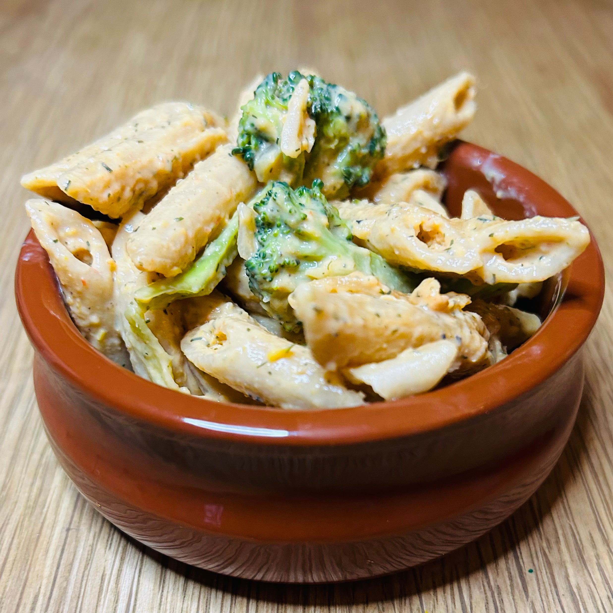 Wholewheat penne pasta tossed in a roasted red pepper sauce packed with broccoli, and balanced with lemon, garlic and dill.