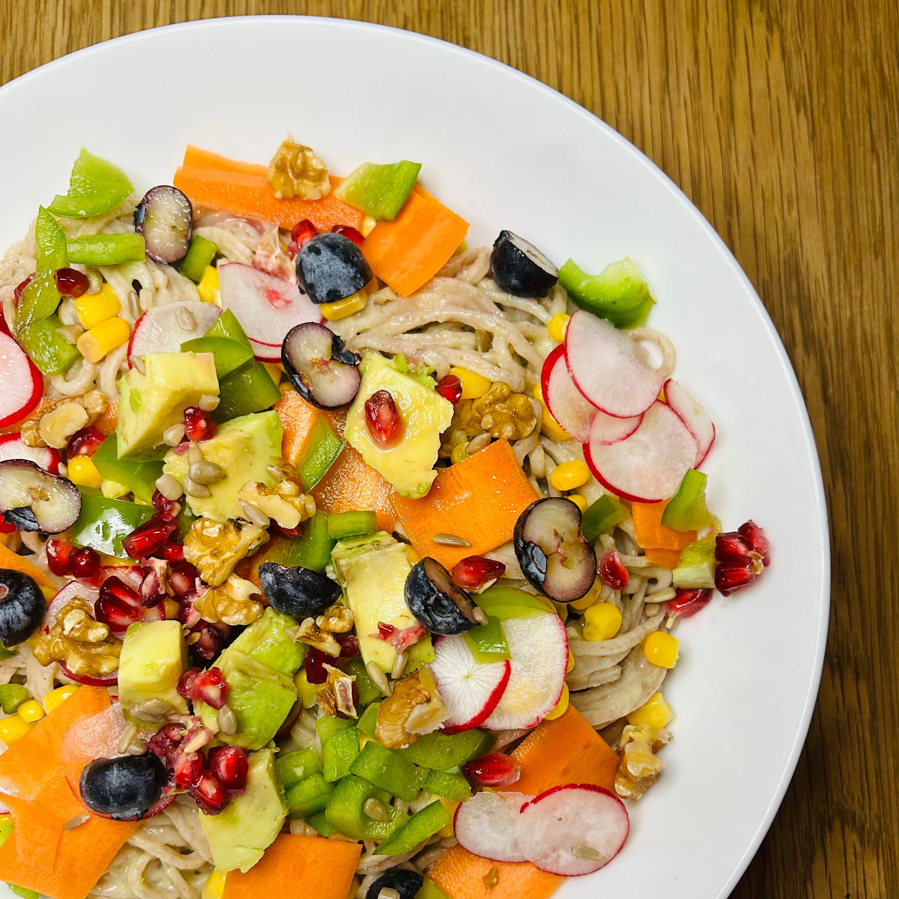 A sweet and zesty salad with Pad Thai noodles, avocado blueberries and radishes topped with Walnuts, sunflower seeds and pomegranate. Cleansing, light and delicious!