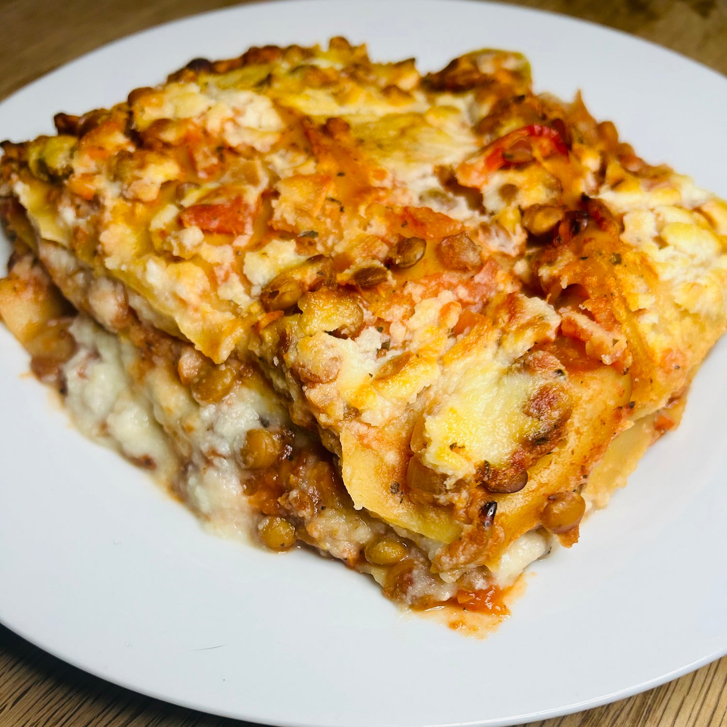 Delicious layers of wholewheat pasta and creamy cauliflower bechamel in a rich lentil and tomato ragu.
