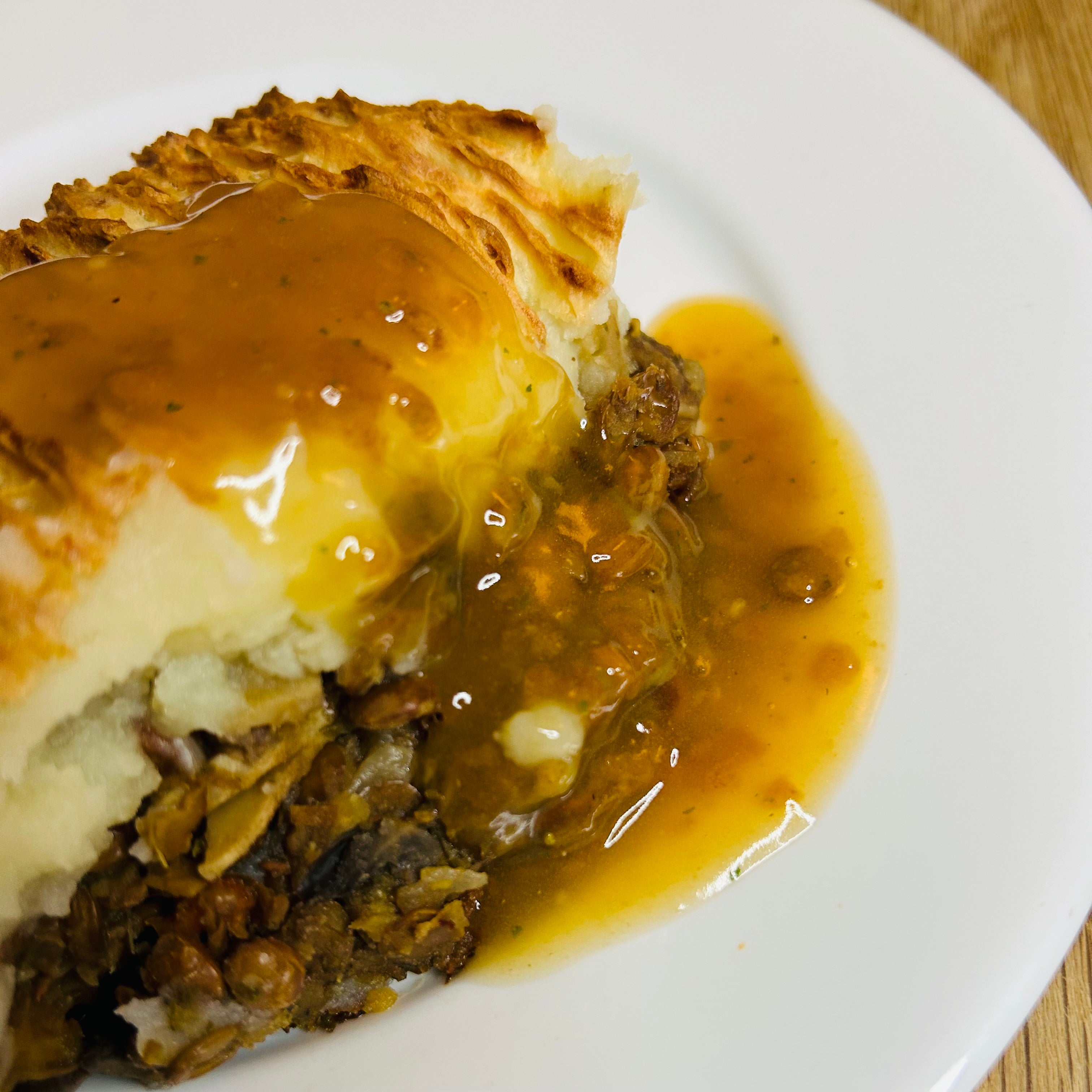 Mell's take on a home cooked classic. Rich lentils and mushrooms slowly baked with parsley and sage and topped with fluffy mashed potatoes. Served with a delicious whole food gravy.