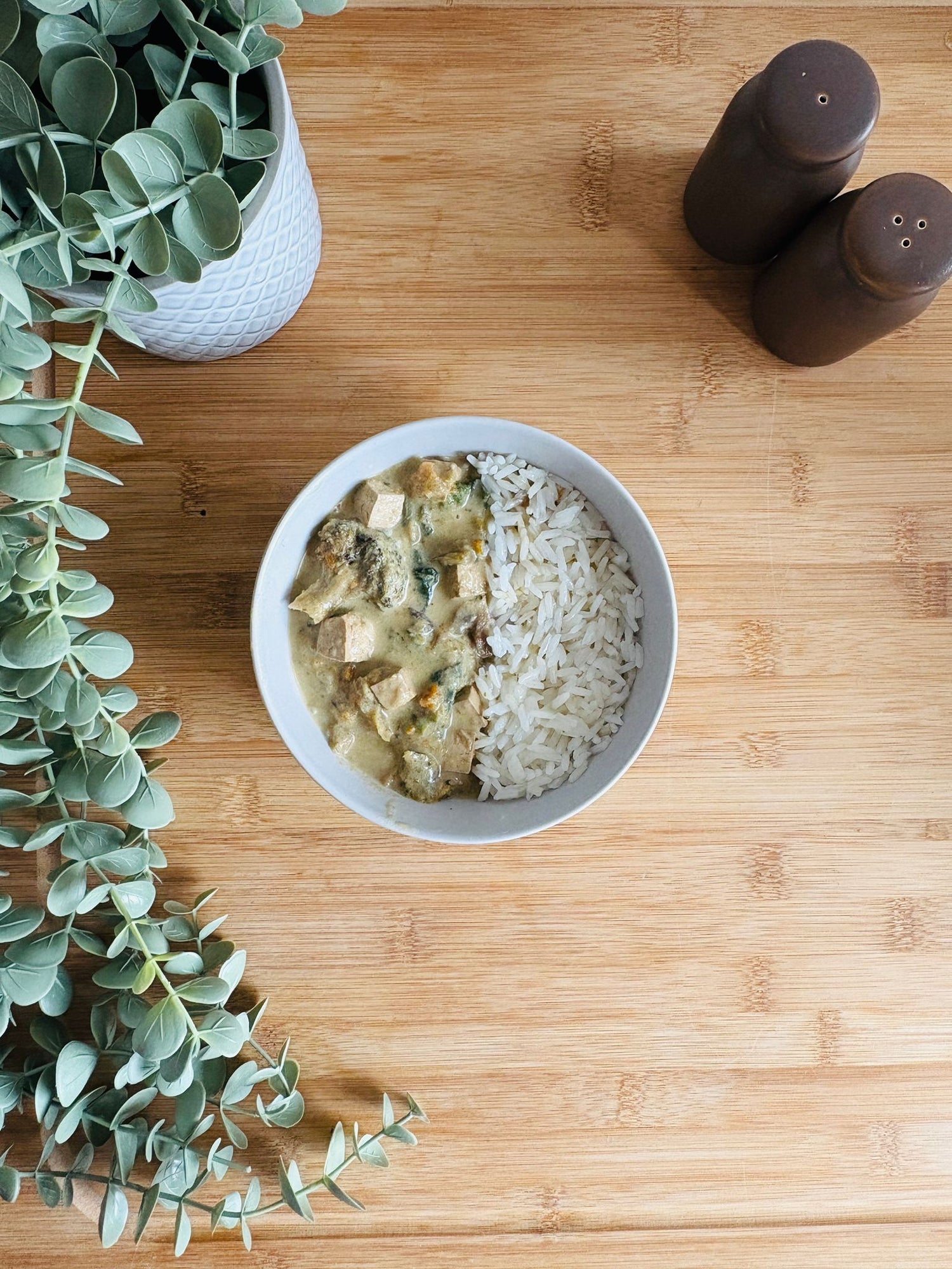 Description: Fragrant, fresh Thai-style curry with firm tofu, broccoli, mushrooms, and vegetables slow-cooked in coconut milk with green chilli and lemongrass. Served with Jasmine rice.