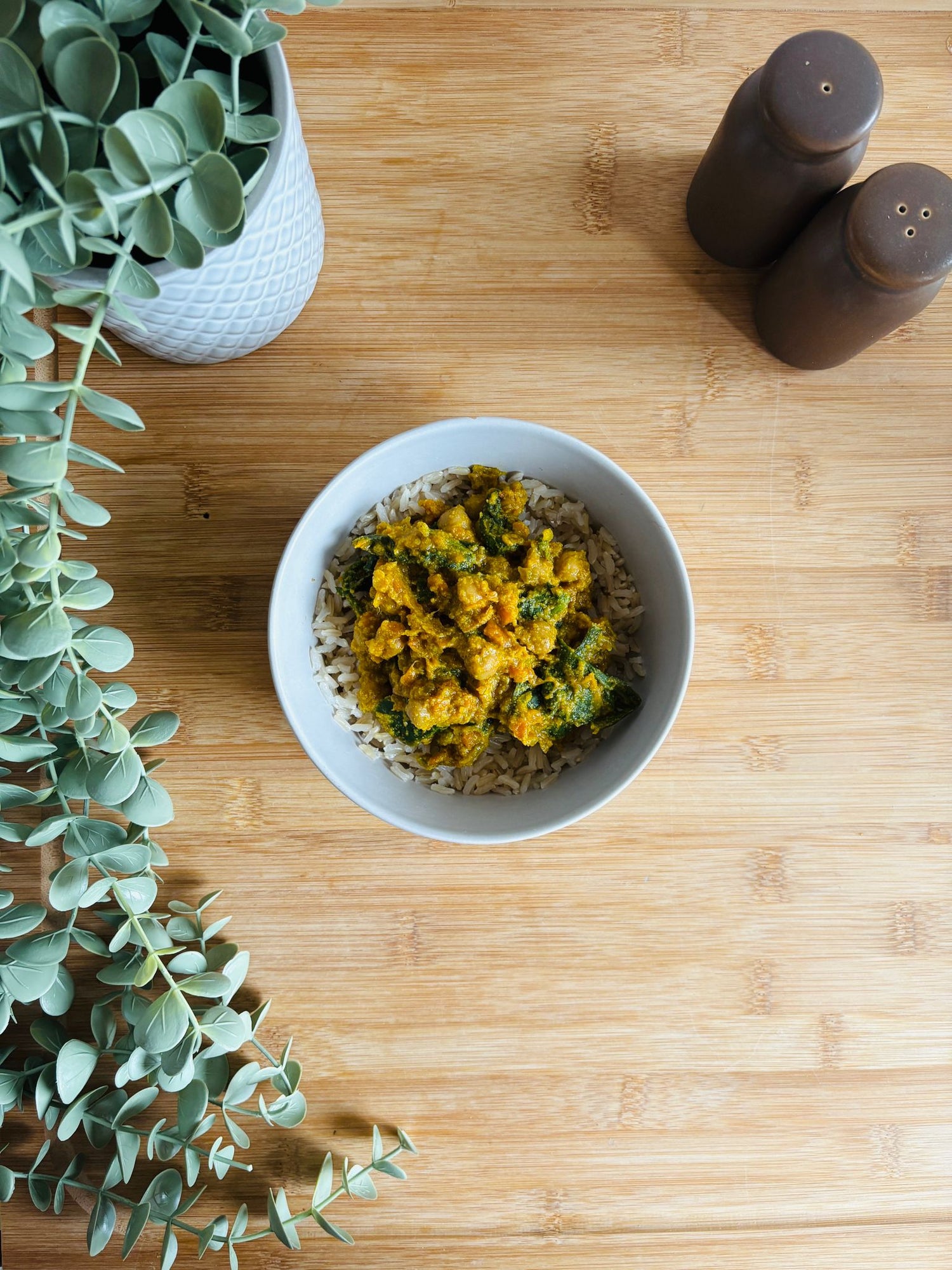 Description: A mild, delicious curry with chickpea, spinach and sweet potato, served with wholegrain rice.