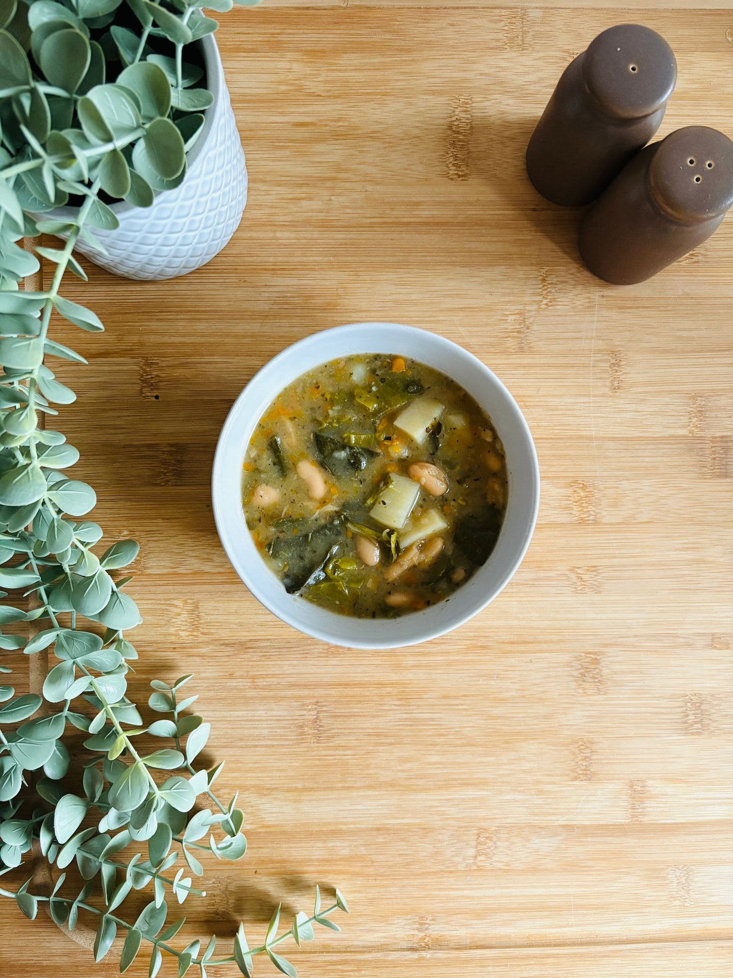 Description: Rustic stew with cannellini beans, potatoes and spring greens — healthy, hearty and flavourful.