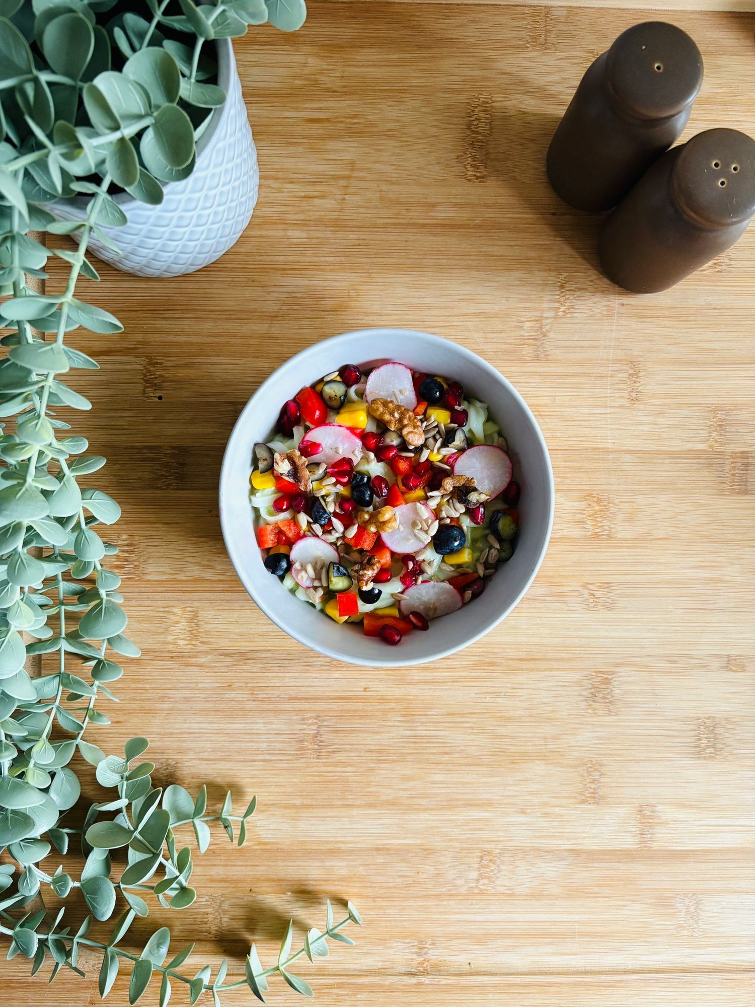 Ingredients: Sweetcorn, Red Pepper, Lime, Pad Thai Noodles (Rice Flour, Water), Radish, Avocado, Pomegranate, Maple Syrup (Carob Fruit Syrup - Carob, Apple - Maple Syrup, Natural Flavouring, Plain Caramel), Sunflower Seeds, Walnuts (Nuts), Sugar, Salt. May contain peanuts and sesame seeds.