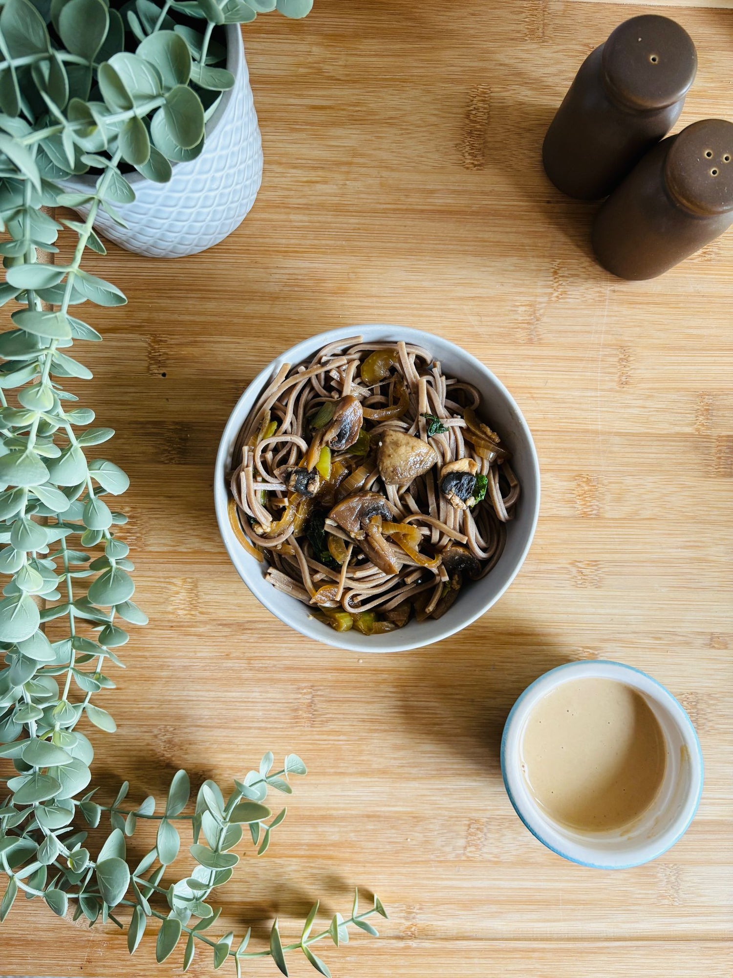 Description: Soba noodles in a soy, lime and ginger sauce with mushrooms, sesame and bok choi. Sweet, salty and bright with a citrus lift.