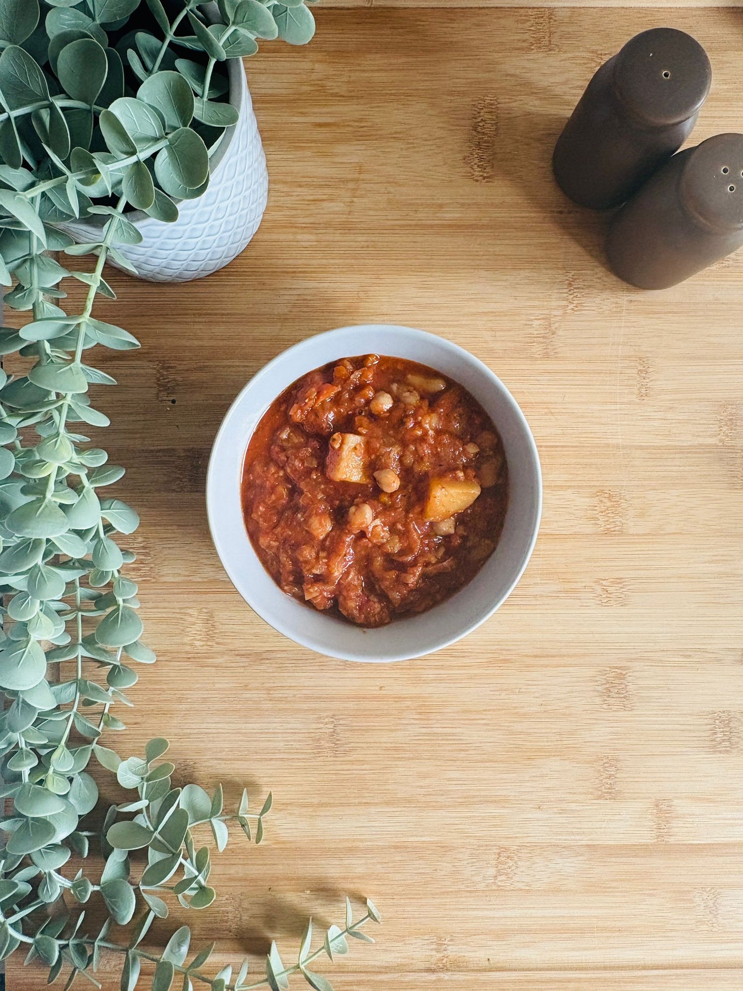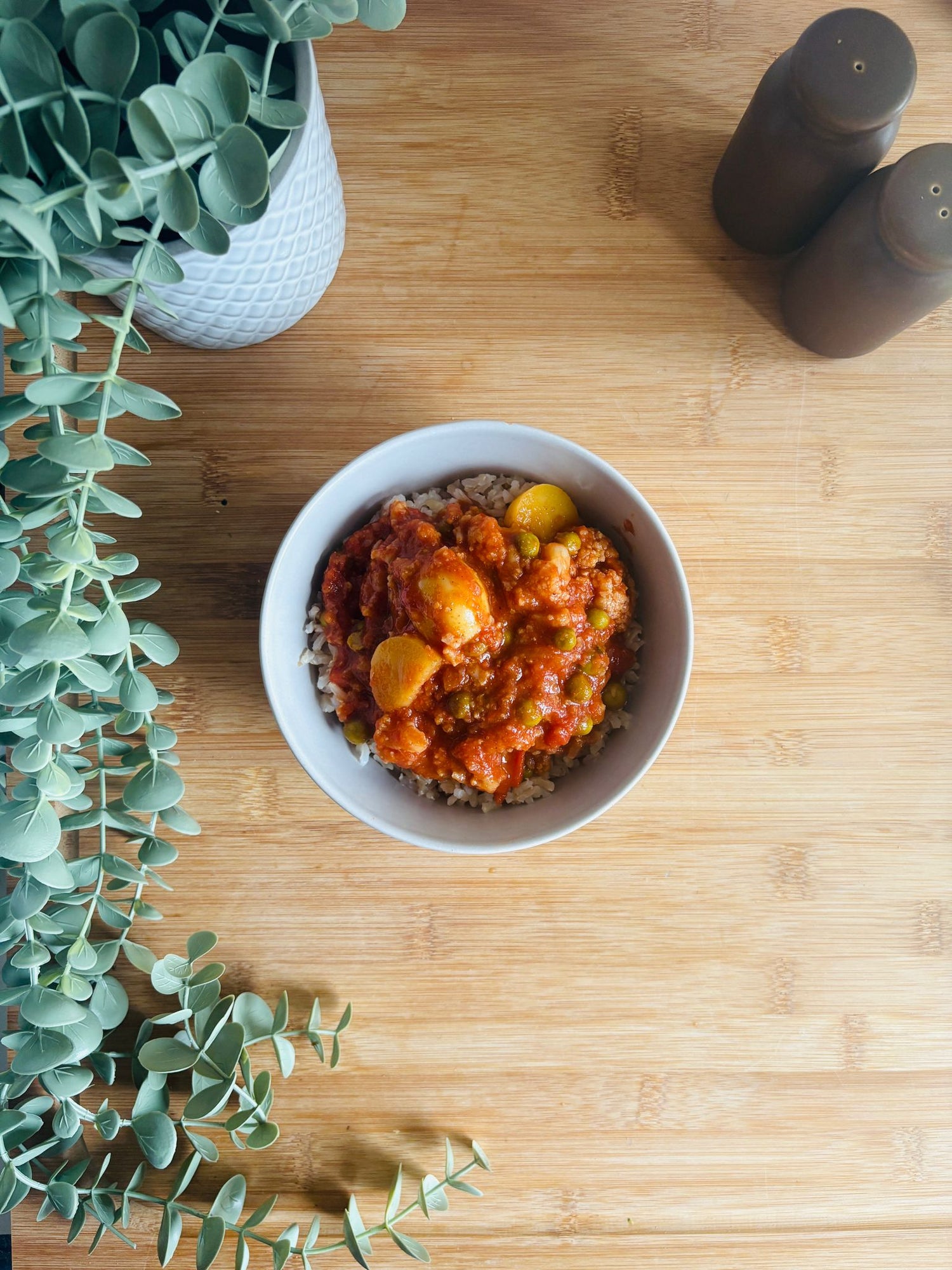 Description: Tangy, flavourful tomato-based curry with skin-on potatoes, cauliflower and peas, served with brown rice.