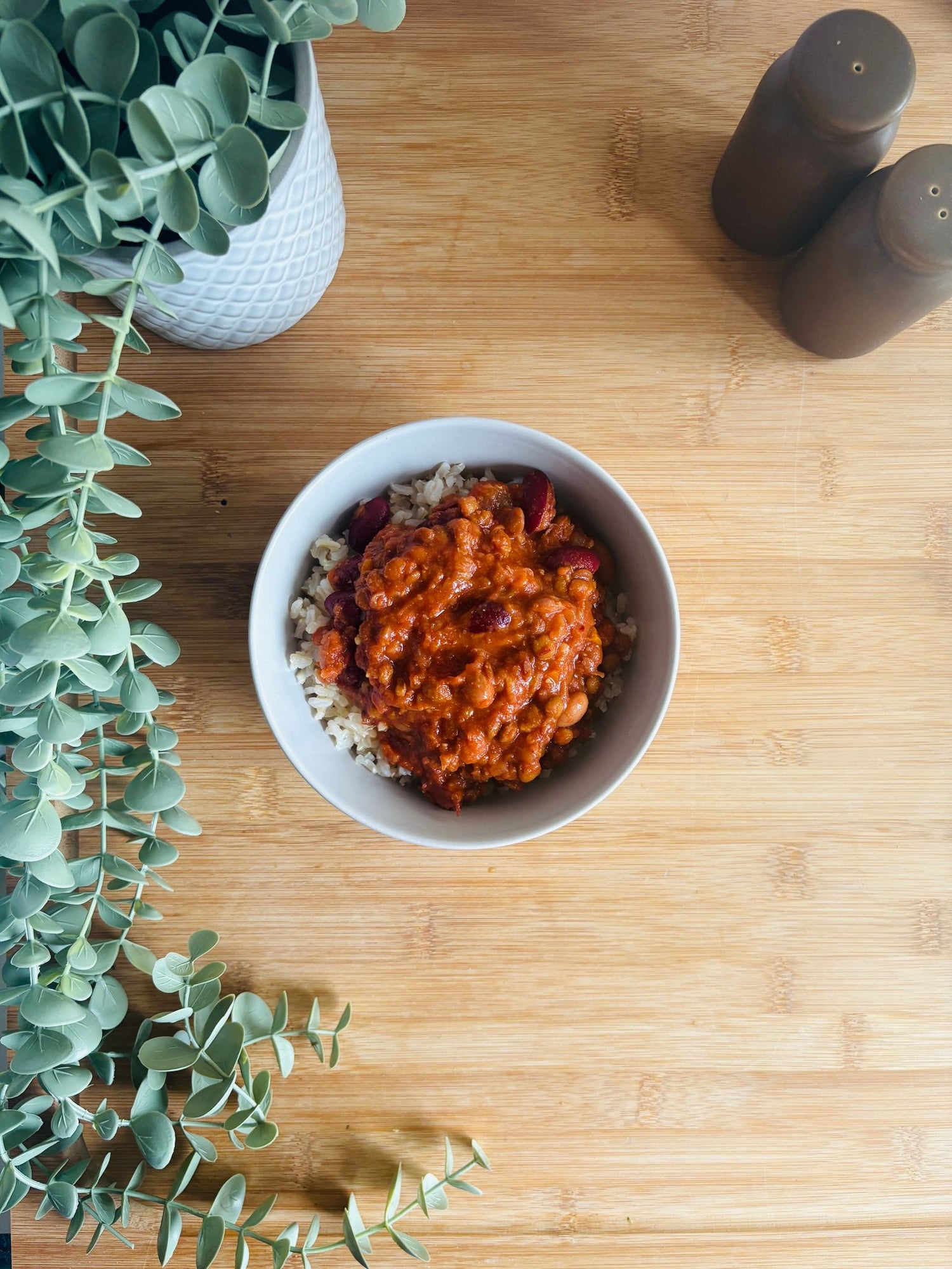 Description: Chilli sans carne with lentils and kidney beans in a classic chilli sauce, served with brown rice.