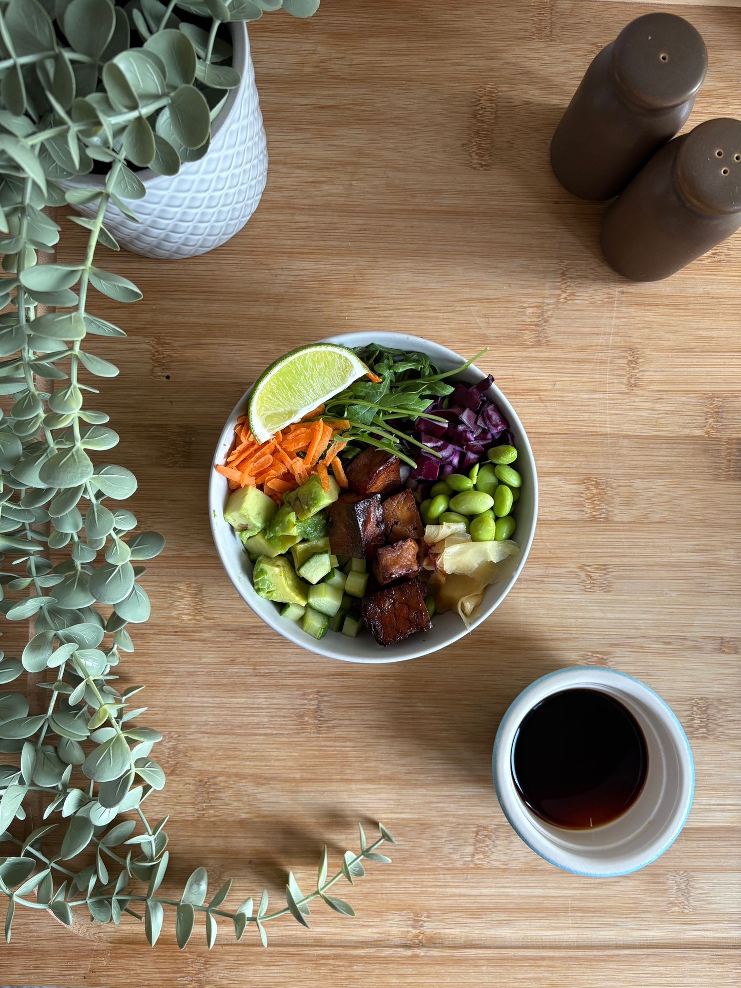 Ingredients: Carrot, Red Pepper, Extra Firm Tofu, Edamame, Rocket, Jasmine Rice, Pickled Ginger, Red Cabbage, Mixed Leaves, Lime Juice, Soy Sauce, Sesame Seeds.