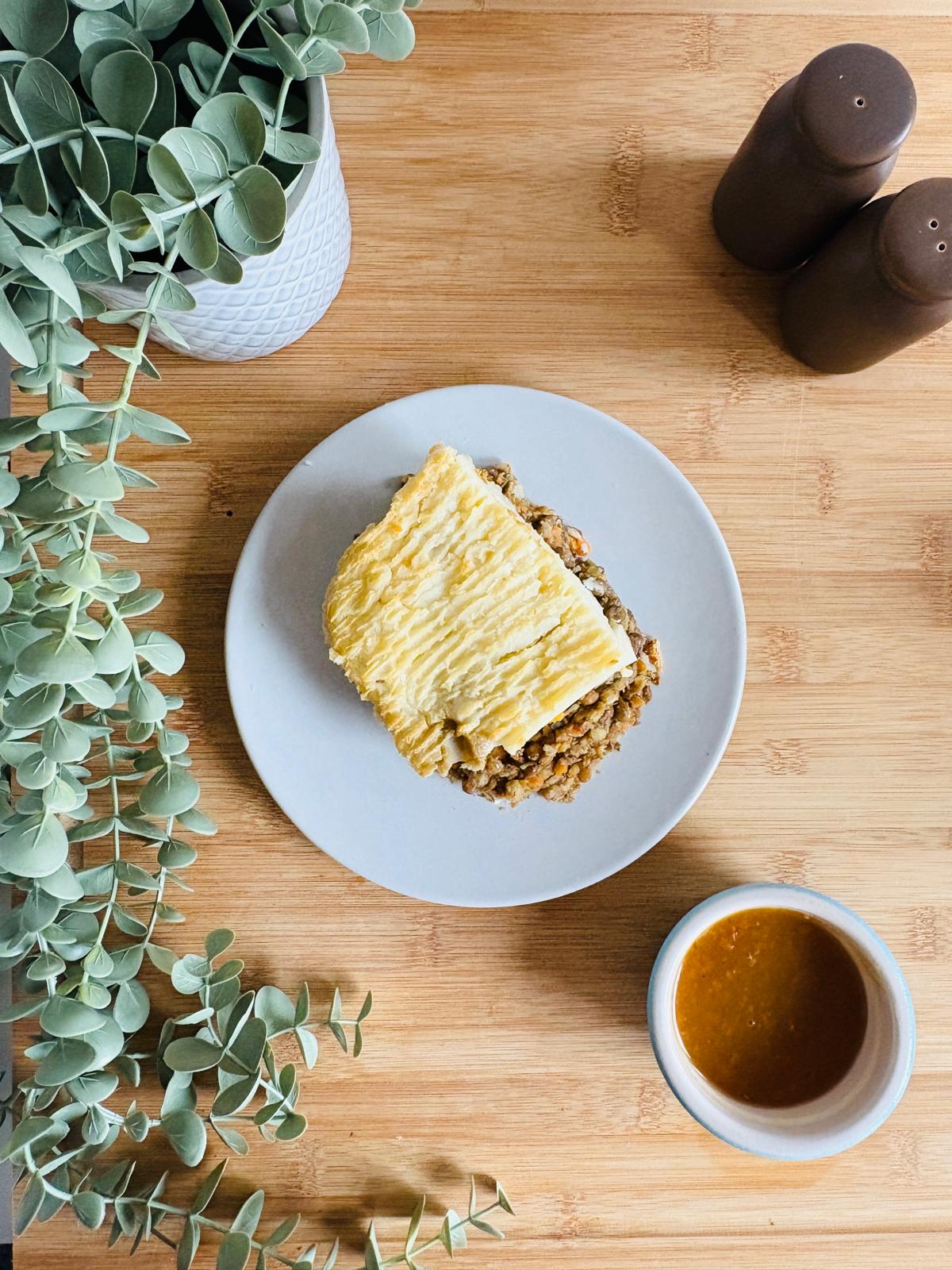 Description: Mell’s plant-based twist on a classic — lentils and mushrooms baked with herbs, topped with fluffy mash and served with whole-food gravy.