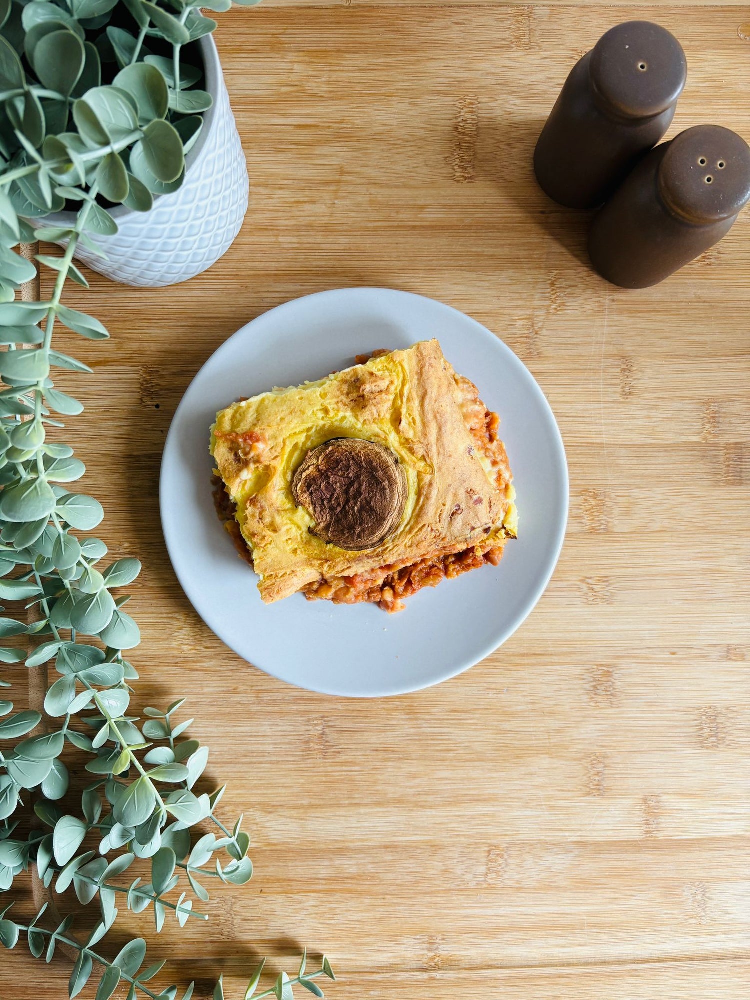 Description: Roasted aubergines with mushrooms and green lentils in a rich tomato sauce, topped with a cheesy mashed potato crust—comfort food at its finest.