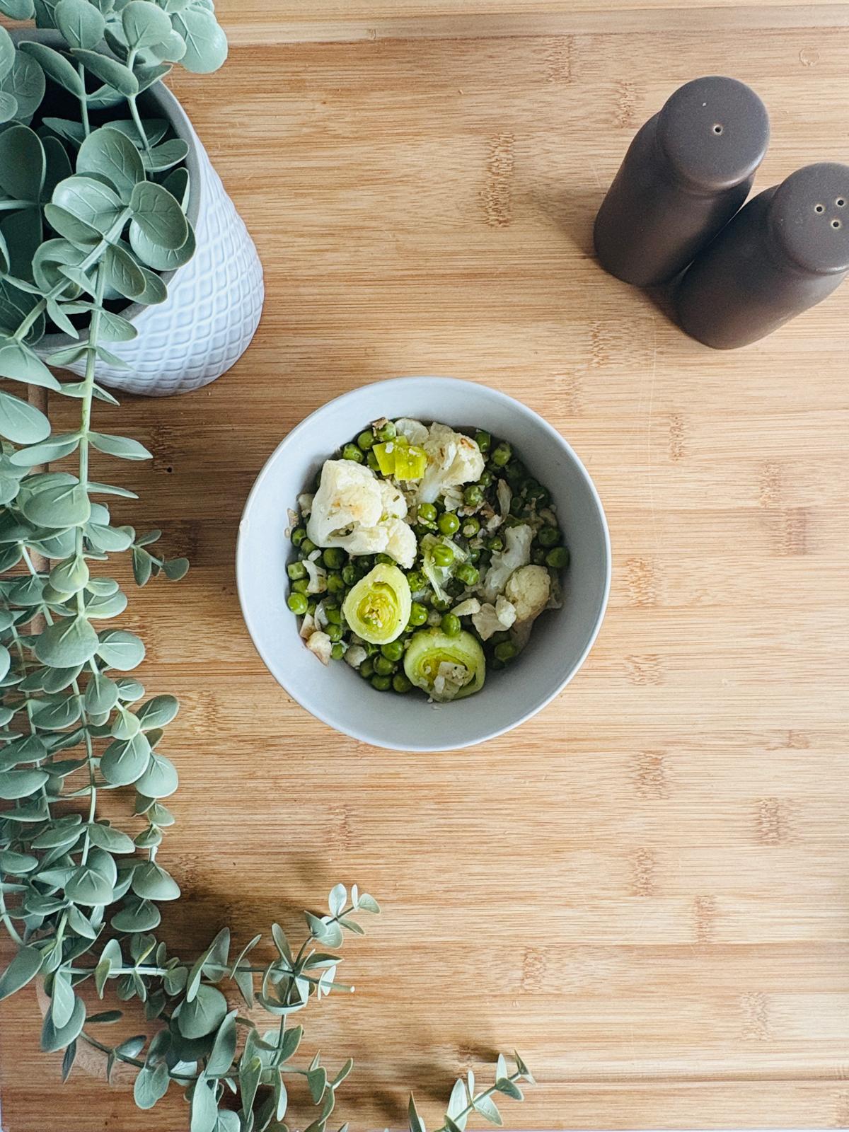 A comforting mix of leeks, cauliflower, and peas, gently tossed with rosemary for a nourishing, no-fuss side that pairs perfectly with any meal.